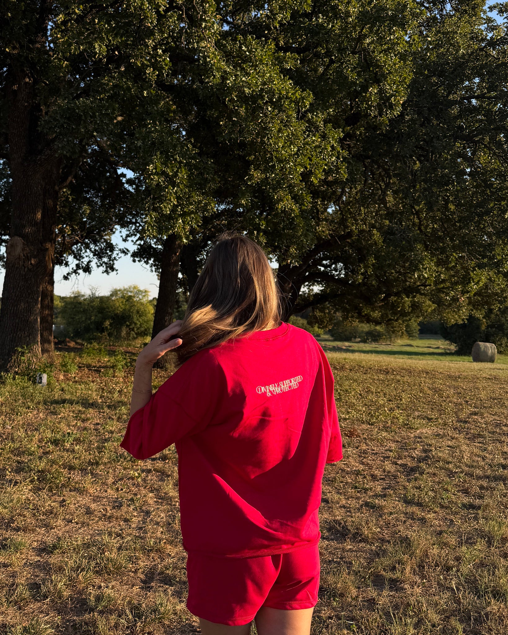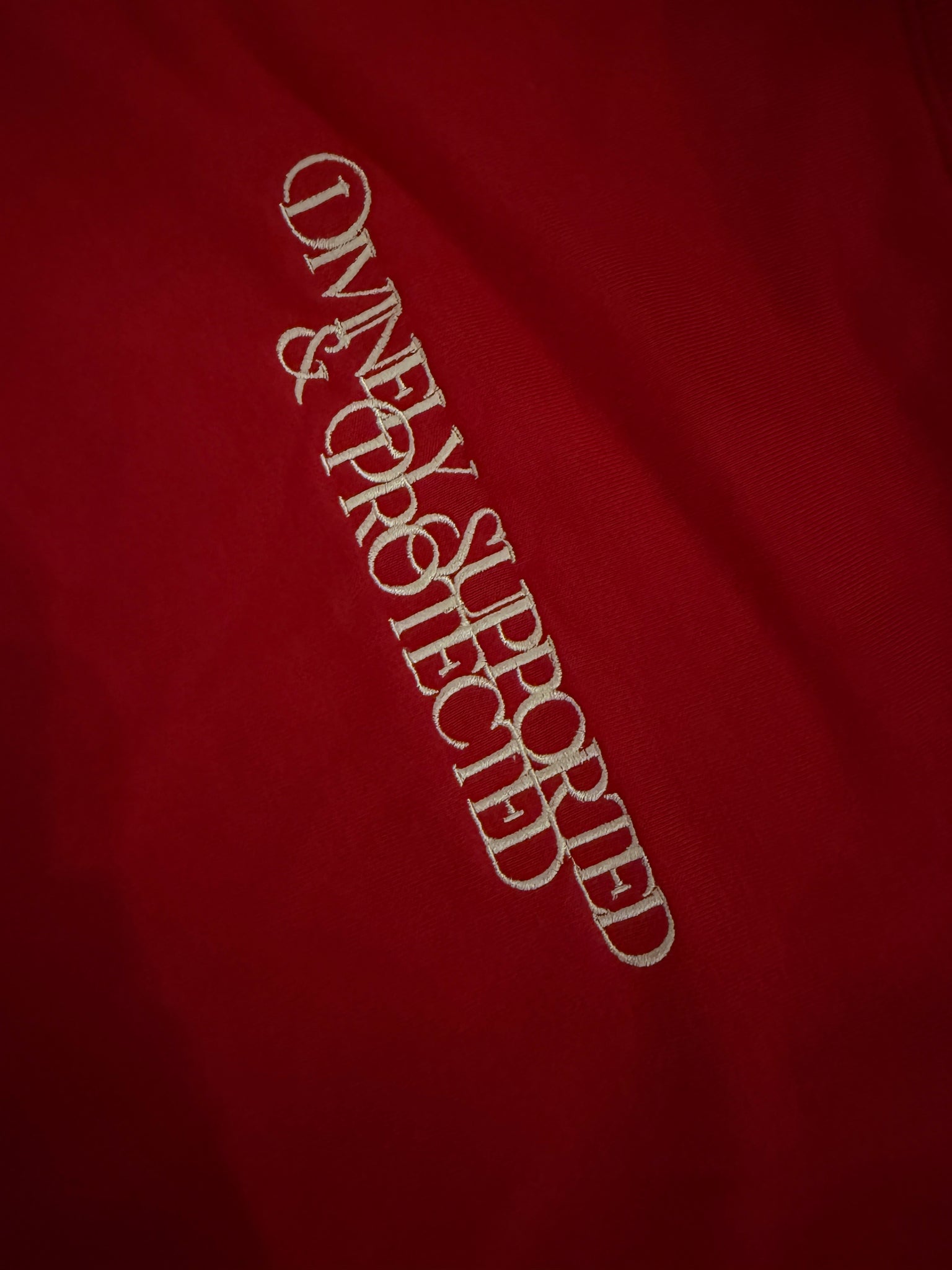 Red oversized set that reads 444 on the front and Divinely supported and protected on the back in a creamy color. Shorts feature drawstring and two front pockets.