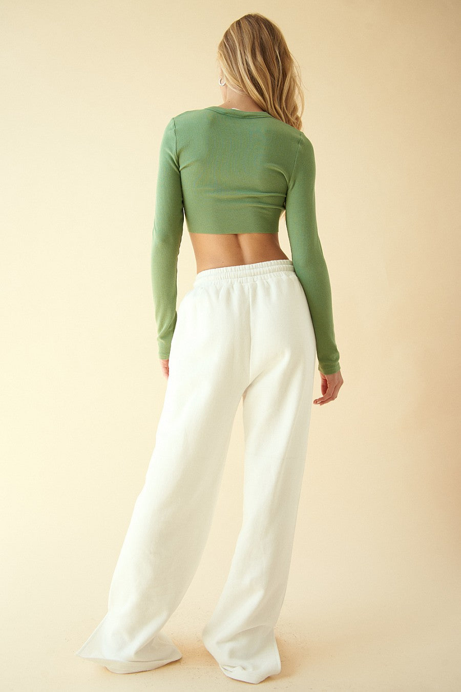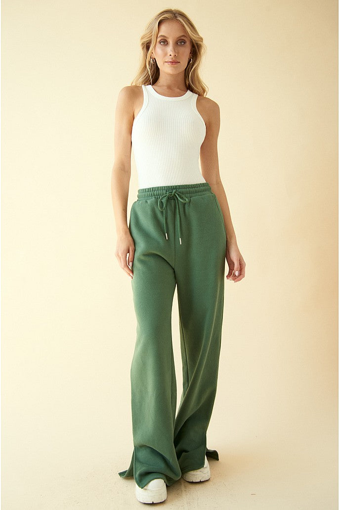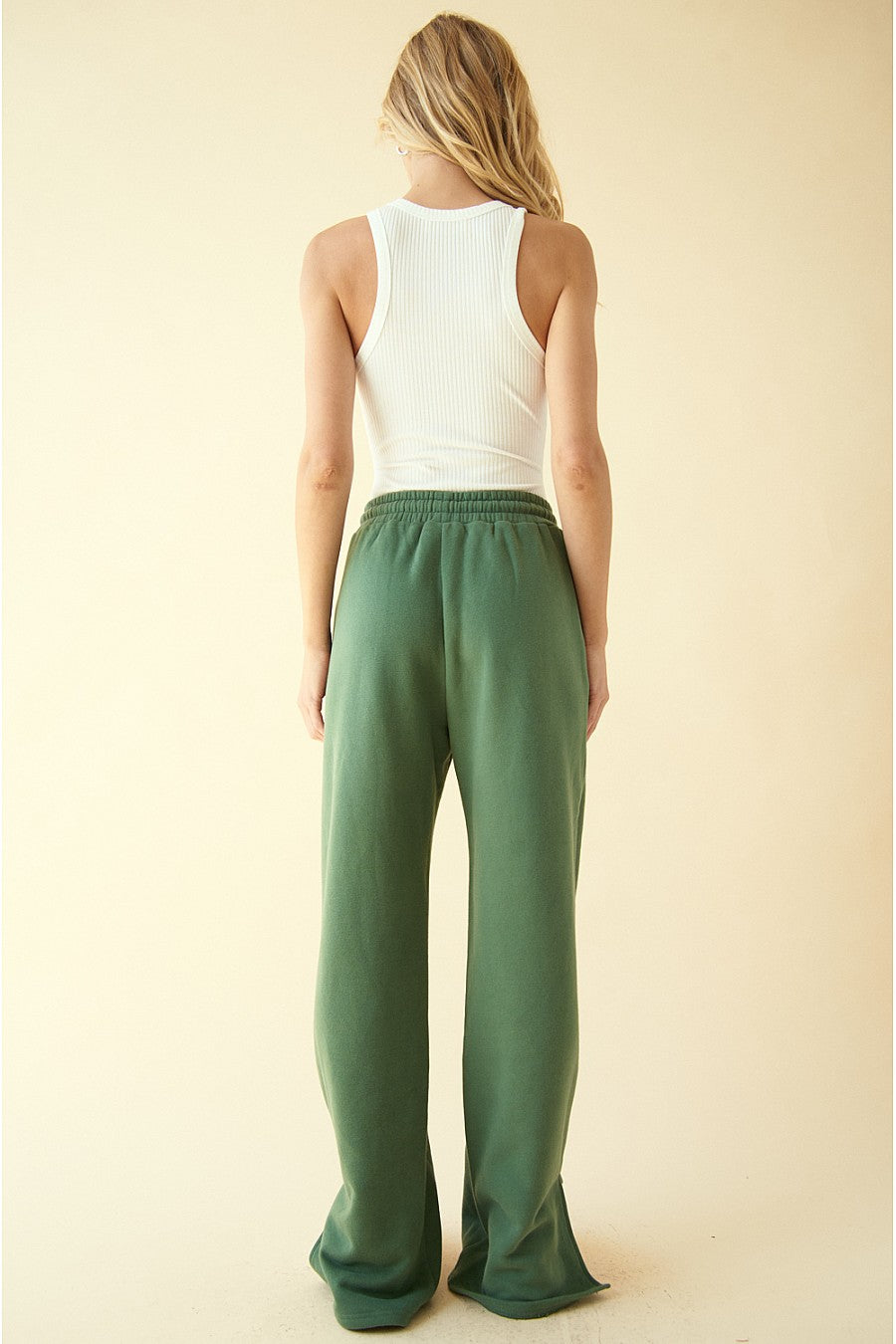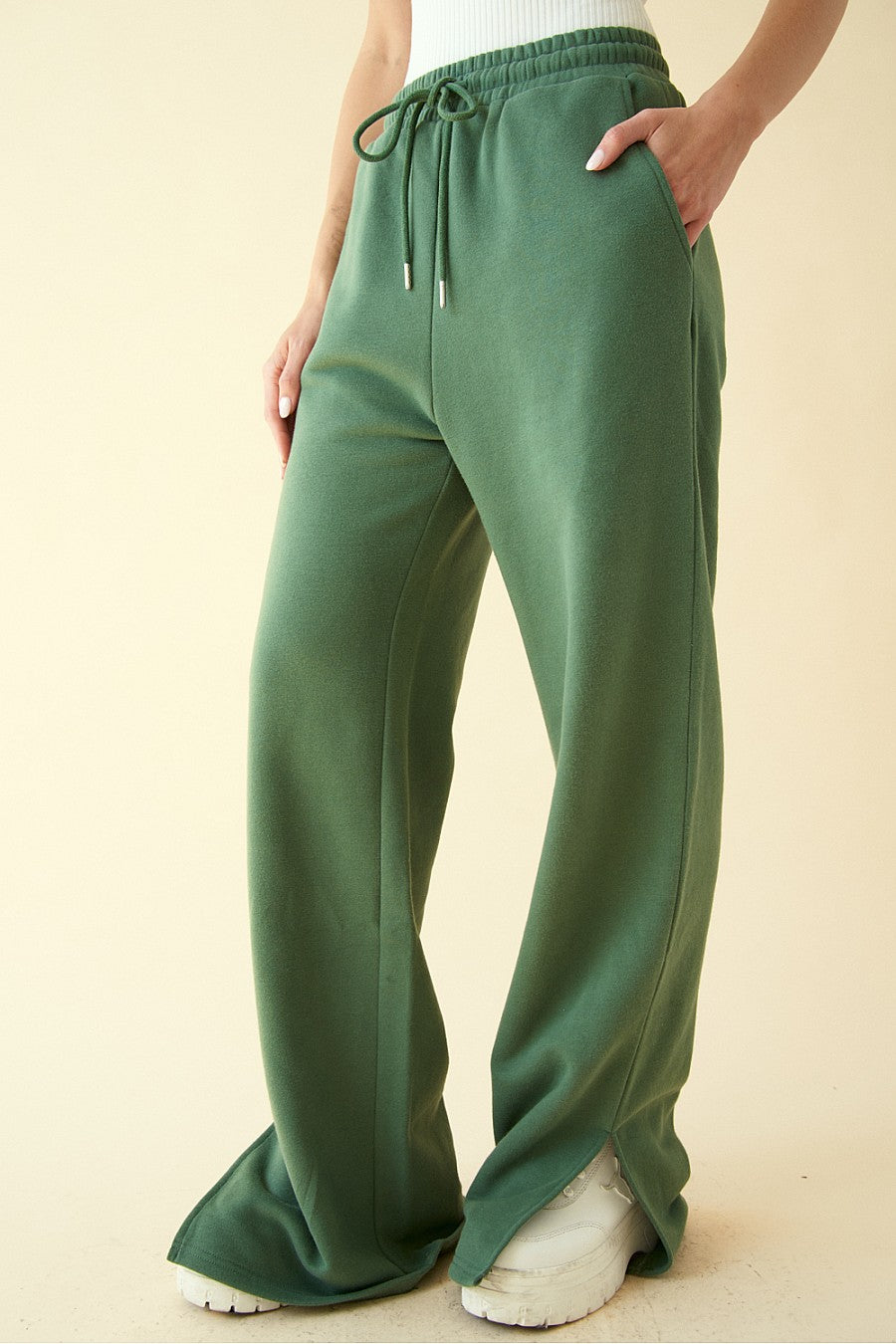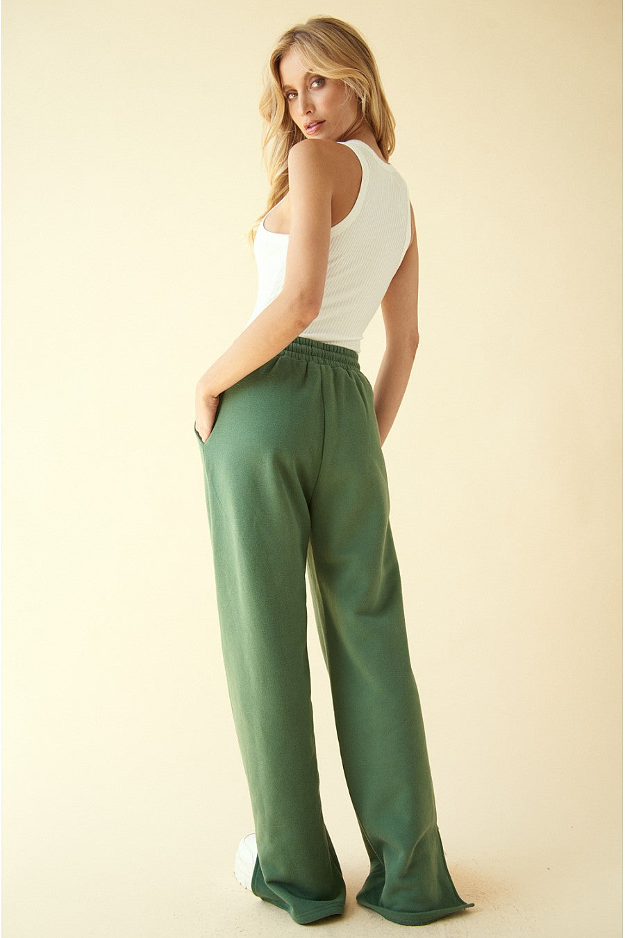 Cotton sweat pant bottoms with a side slit. Available in olive green and creamy white.